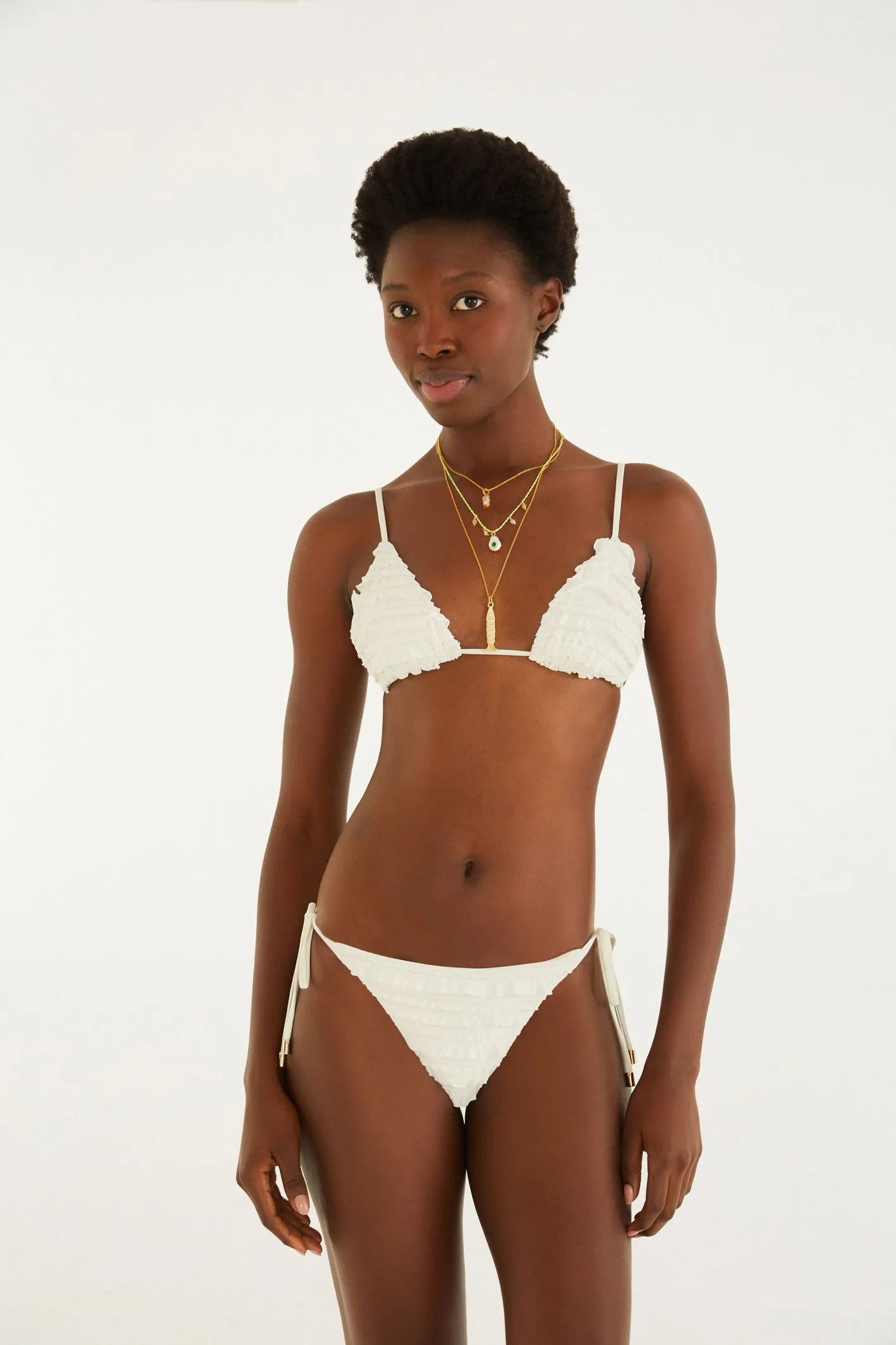 biquini lacinho babados textura. com amarrações laterais práticas, este modelo apresenta babados delicados que conferem charme e movimento. as alças finas ajustáveis garantem conforto e adaptação ao corpo. perfeito para um dia de praia ou piscina, elevando qualquer produção casual com um toque de originalidade. FARM Rio, coleção Carioca - inverno 26.