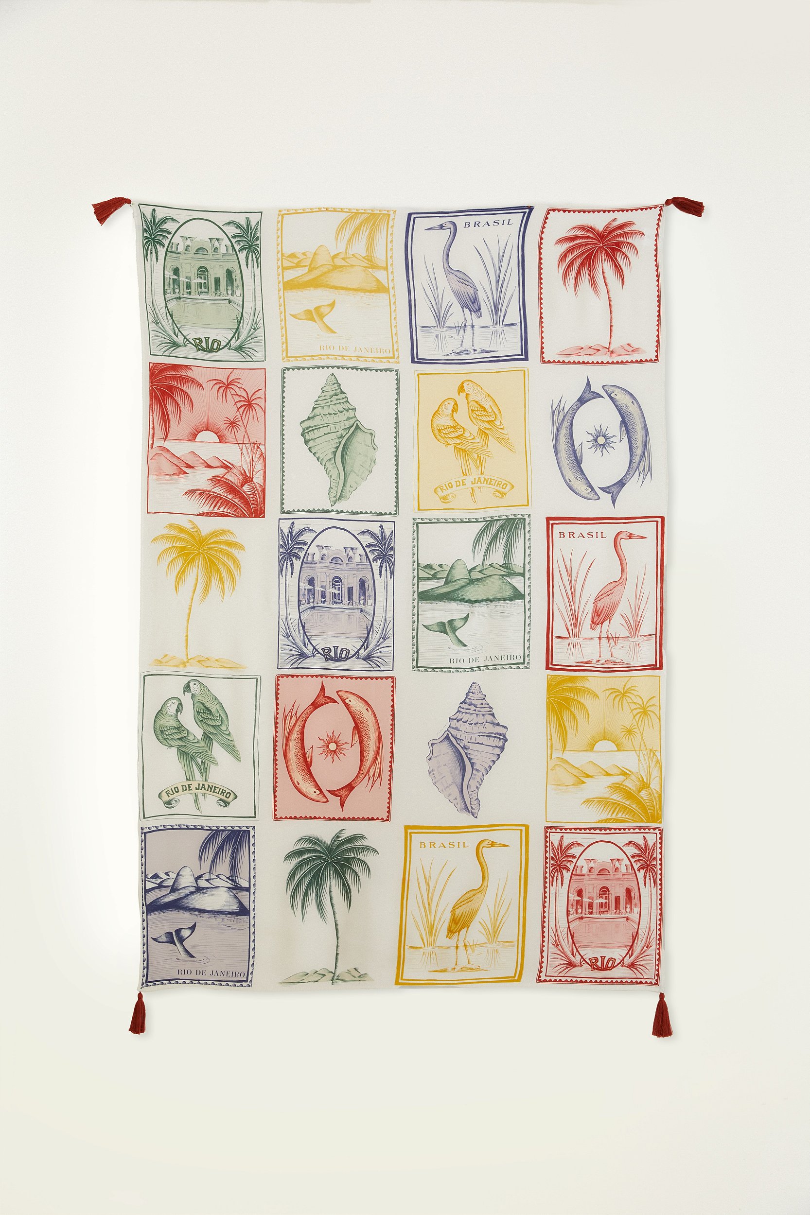 canga estampada brasil vintage achadinhos. tamanho generoso para diversas amarrações, feita em tecido leve e fluido. traz um toque tropical e retrô com seu design único. os elos nas extremidades garantem acabamento especial. perfeita para dias na praia ou piscina. FARM RIO original - verão 26.
