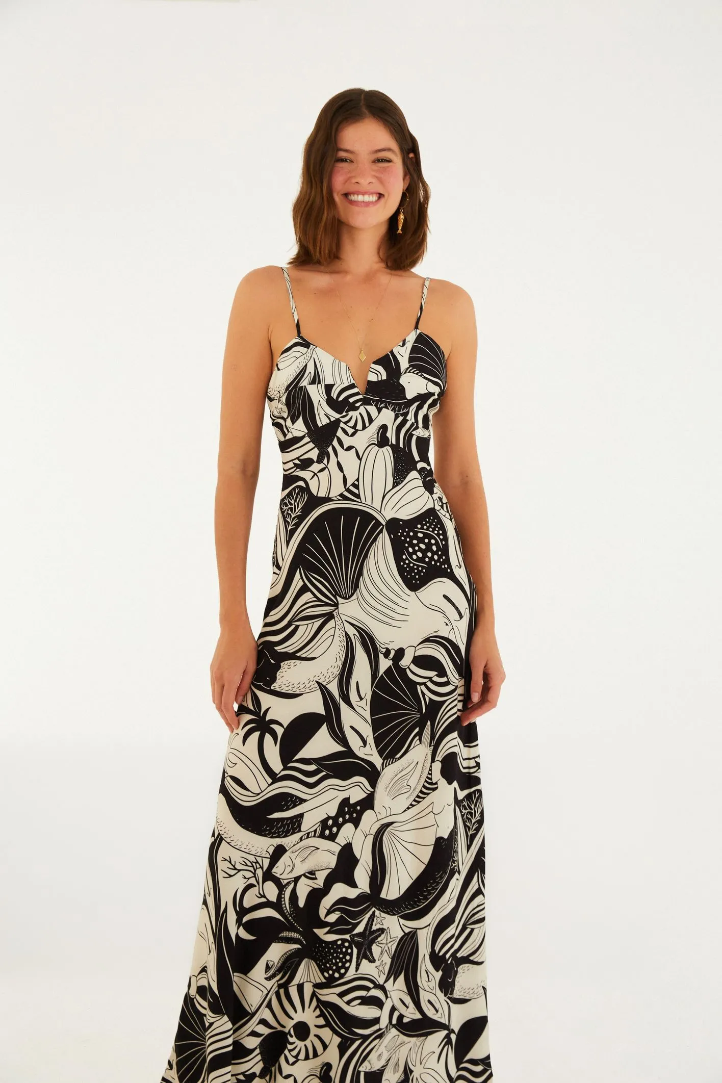 vestido alcinhas estampado festa de mar. o decote em v aliado às alças finas traz um toque leve e refrescante. a modelagem fluída proporciona liberdade e conforto. o acabamento cuidadoso faz desta peça uma escolha única para eventos casuais, passeios ao ar livre ou um encontro especial. FARM RIO original - verão 26.