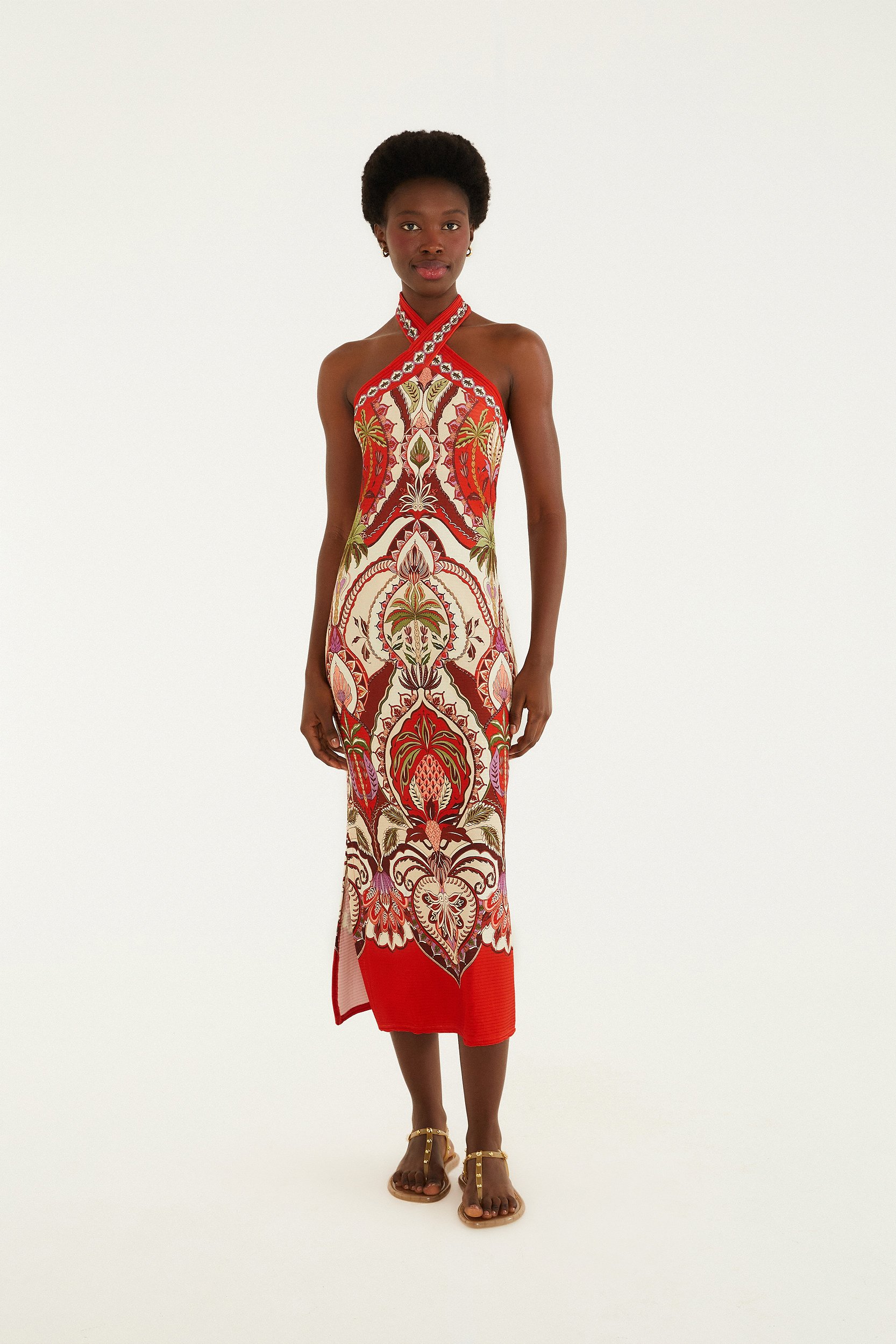 vestido midi estampado Odara. com decote halter, o modelo sem alças destaca a originalidade em cada detalhe. a saia fluida proporciona movimento leve, ideal para ocasiões casuais e ao ar livre. a combinação perfeita entre conforto e estilo, com acabamento impecável. FARM RIO original - alto verão 26.