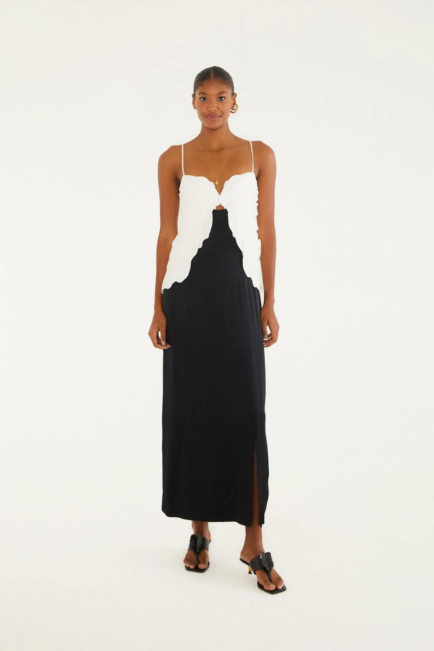 vestido pétalas gabrielle é um convite à originalidade. com alças delicadas e decote central inusitado, traz um mix harmonicamente ousado de texturas. a saia longa e fluida oferece liberdade ao caminhar, enquanto as fendas laterais garantem movimento. perfeito para ocasiões especiais que pedem um toque de criatividade autêntica. FARM RIO original - verão 26.