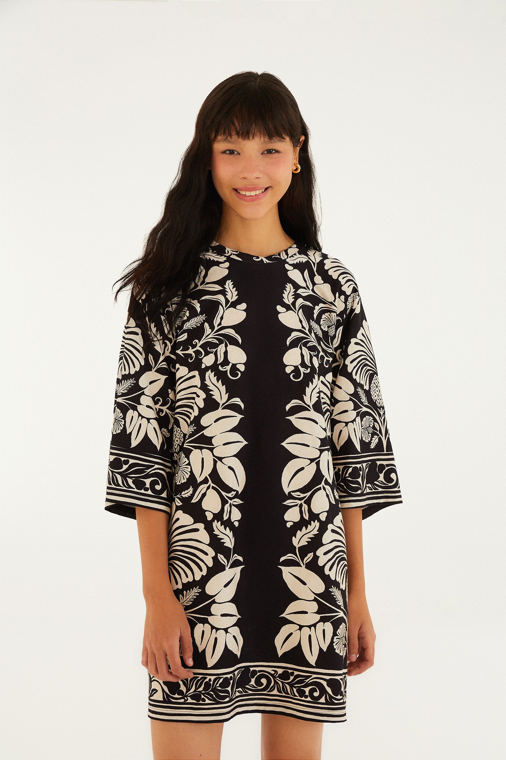 vestido t-shirt big estampado sintra. com gola redonda e modelagem solta, proporciona conforto sem perder o charme. suas mangas são amplas, garantindo um toque casual ao visual. perfeito para ocasiões diurnas ou noturnas, ele é a peça ideal para quem busca autenticidade e estilo em um único look. FARM RIO original - verão 26.